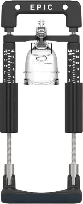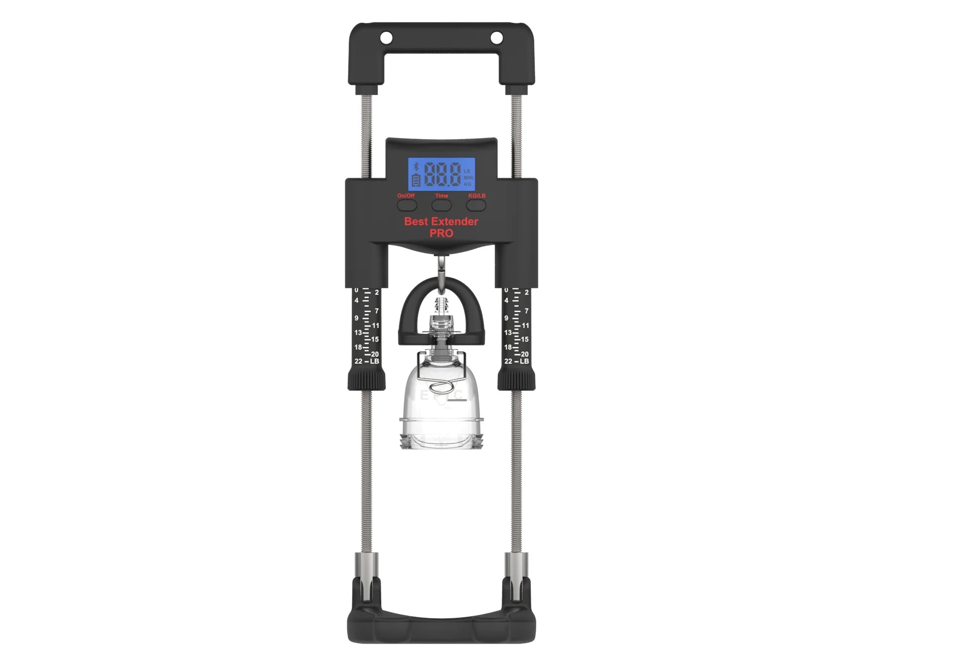 Extender device with digital tension scale, padded silicone base, adjustable straps, PeniMaster cup adapter